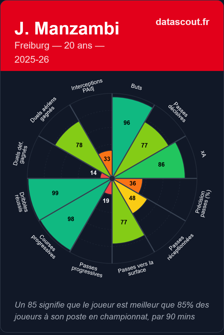 Et si Fribourg réalise une aussi belle saison, c’est en grande partie grâce à sa pépite suisse, Johan Manzambi. Milieu de terrain athlétique, doté d’un énorme volume de course, qu’il utilise pour progresser balle au pied. Un pur box-to-box, doué offensivement et surtout décisif ! Déjà 13 contributions décisives pour lui cette saison toutes compétitions confondues. En bref, c’est le profil idéal pour évoluer en Bundesliga. Un championnat où les transitions sont reines et où les avaleurs d’espaces de son genre, sont rois.
